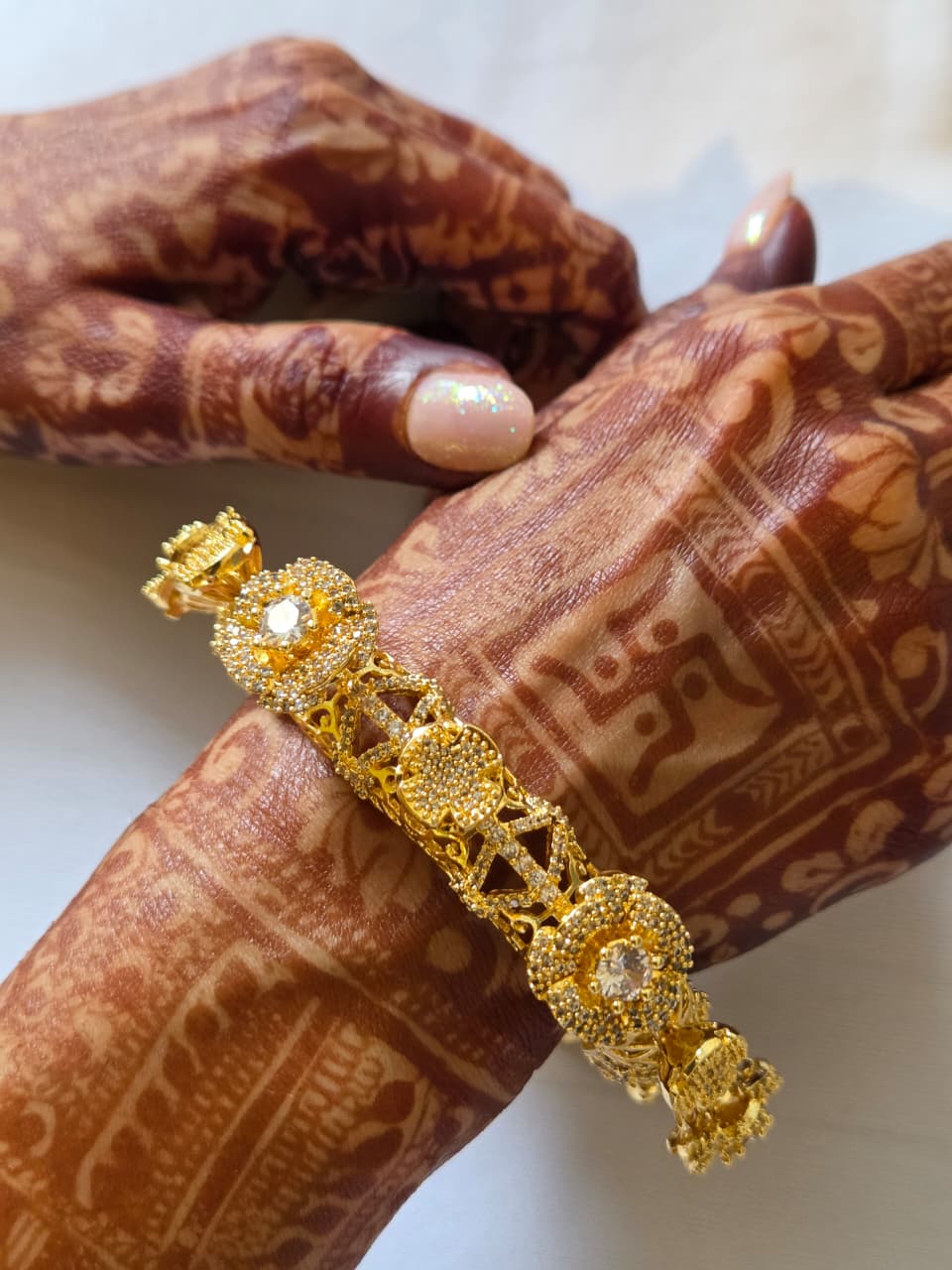 Introducing our Gold Finish Zircon Studded Bangle, the perfect addition to your luxury jewelry collection. Crafted with a stunning gold finish and adorned with sparkling zircon stones, this bangle is sure to turn heads. Elevate your style and exude elegance with this timeless piece.