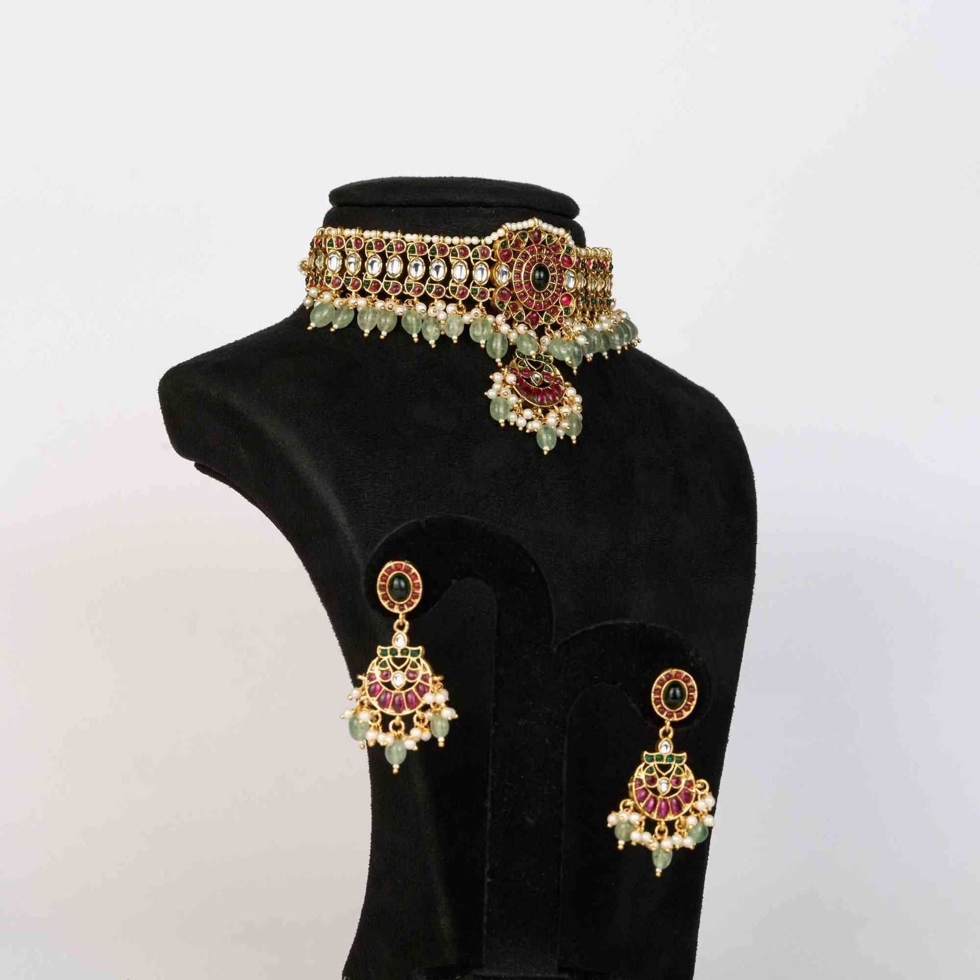 Elegant necklace set crafted in 22kt gold plating, studded with high quality stones and finished with graceful jade bead drops. Perfect for weddings, festive wear, and statement styling.