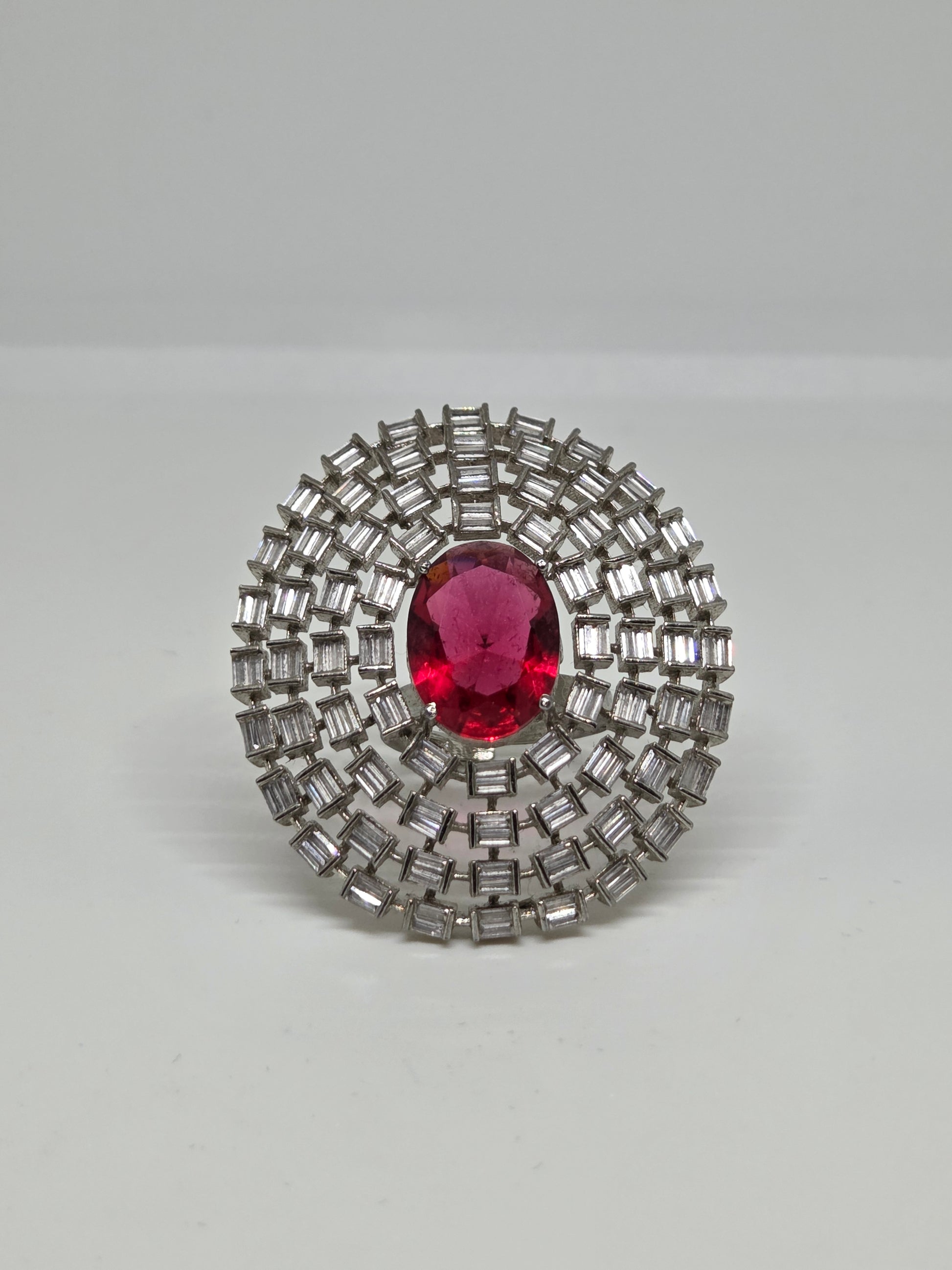Precious and a statement ruby embedded in Zircon diamonds in silver polish for everyday wear or special evenings.