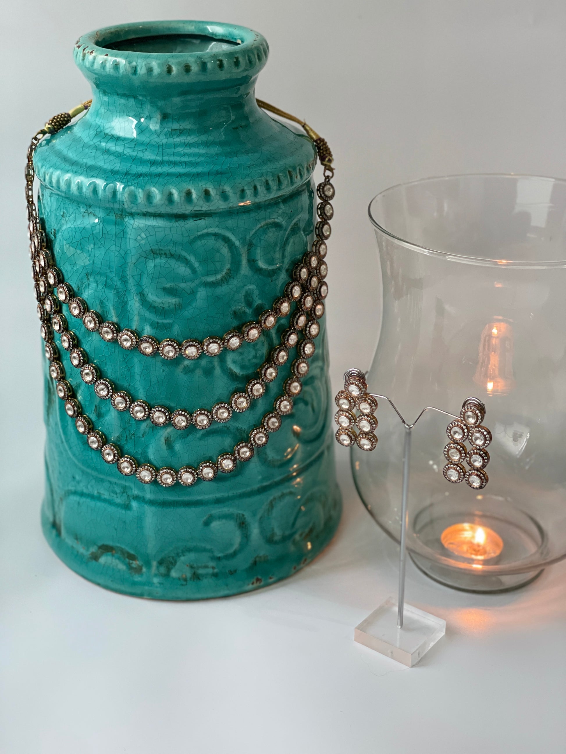 Turn heads and dazzle with this two-tone Kundan layered necklace set! With its layers of shining, golden kundan stones, it gives you the eye-catching sparkle you need to stand out and look your best. It's a must-have accessory for those who live life in the (bling) lane!