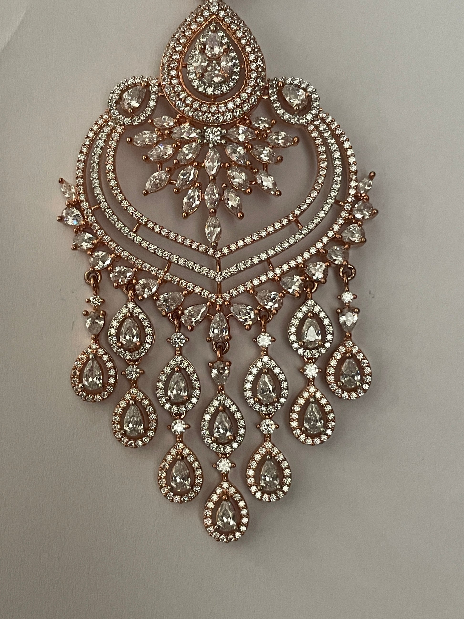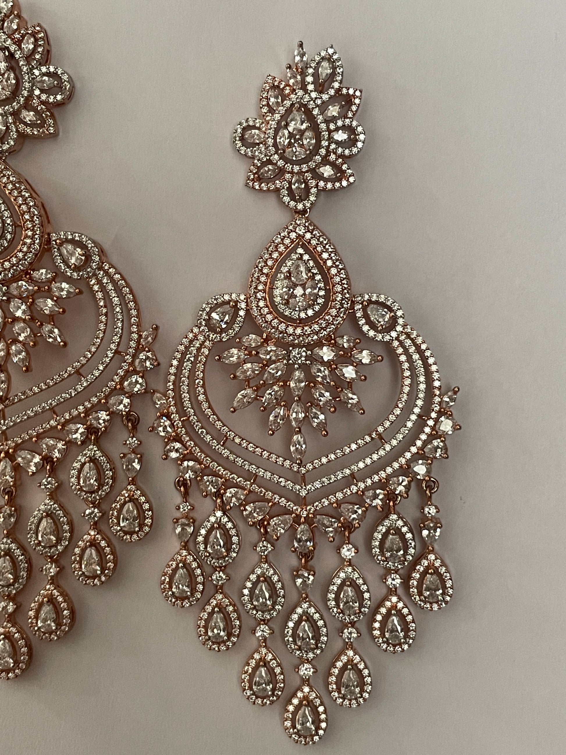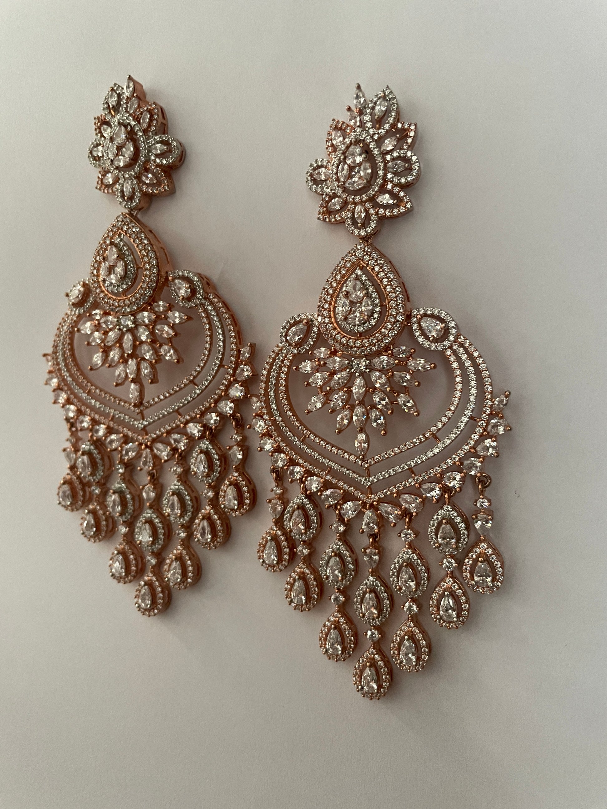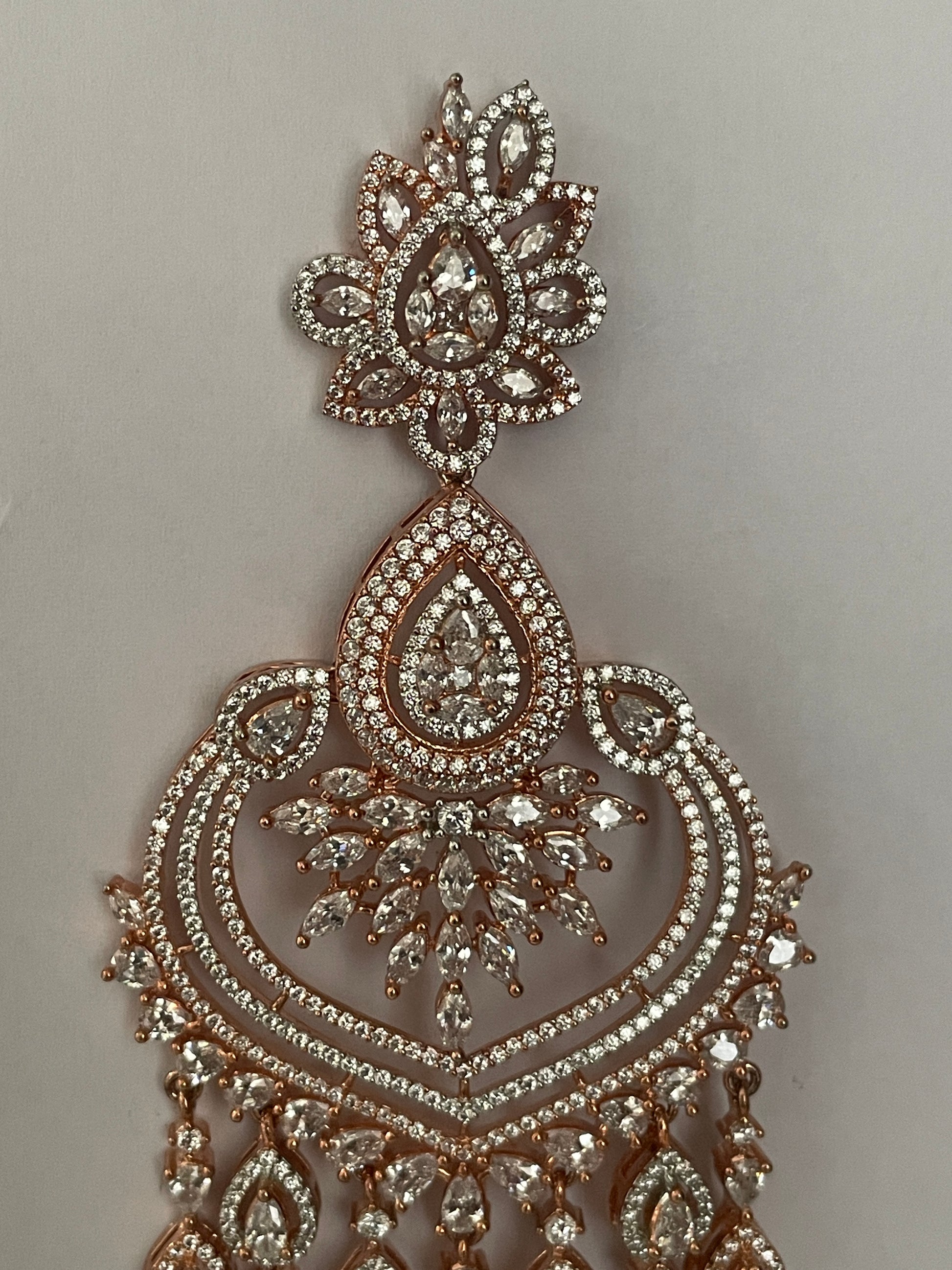 These exquisite chandelier earrings are an epitome of opulence and intricate craftsmanship. They feature a cascading design adorned with shimmering diamonds and a teardrop motif as the centerpiece. The floral-inspired detailing at the top adds a regal charm, while the multiple tiers of pear-shaped elements create a dynamic and elegant flow. Perfect for weddings or grand celebrations, these earrings exude a timeless appeal, making them an ideal choice for anyone looking to make a statement.